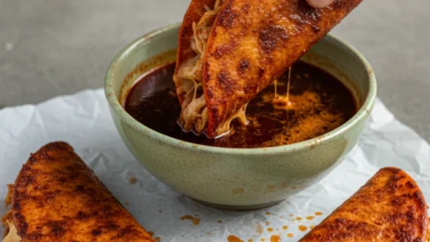 The “crispy” element comes from the preparation method. Corn tortillas are dipped in the fatty top layer of the consomé, which imparts a reddish hue and flavor. They’re then filled with shredded birria meat, generous amounts of cheese (Oaxaca for authenticity, or mozzarella as a substitute), chopped onions, and cilantro. Folded like a quesadilla, they’re pan-fried until the exterior is golden and crisp, while the inside melts into gooey perfection. This frying step uses the consomé’s fat, eliminating the need for extra oil and adding that signature crunch.