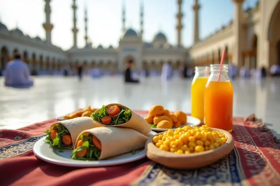 Dates (especially Ajwa from Madinah), Zamzam water, nuts, seeds, and dried fruits are essential. These provide quick energy, potassium, and hydration in the hot climate. Pair them with grilled chicken, lentil soup, or rice-based dishes like Kabsa or Saleeg. Avoid heavy fried foods if possible during long prayer sessions. Many pilgrims carry small packs of mixed nuts and dates for quick snacks between tawaf or sa’i.